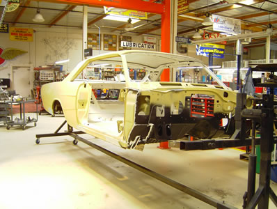 primed to seal the metal. The next step will be to go over the entire body to make sure there are no body imperfections like small dents and scratches. During the restoration, Jay's full time body man, Per, left for a month vacation so progress came to a halt. Even with a month "delay", the progress has been amazing. In the begining of August, Per was back to work and things moved along quickly. Some variations are being made to the car, but all are in keeping with the spirit of the manual shift 7-Litre. Jay has opted for a custom built Roush FE engine, with fuel injection that will produce 590hp. The stock 4 speed will be |