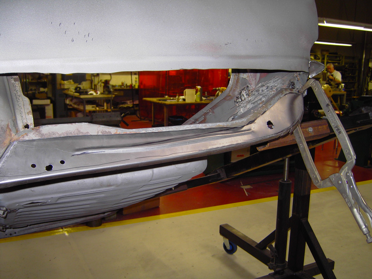 of the swirls marks. Once all painted parts of the car were finished, it was time to get the body back on the frame. Because Jay opted for the custom Roush 511, the suspension and frame got some upgrades to handle the substantial increase in Horsepower and Torque. Jay's recent acquisition of a Snaptrac, made the process of reuniting the The finished frame is rolled under the suspended body.
