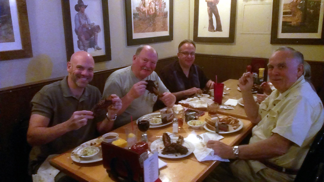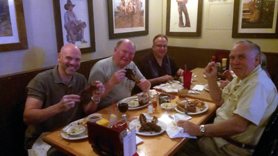 parts of the ship that are under restoration (every year, Russ volunteers while he is visiting). After the Midway, Russ got a call from another Association member by the name of Allen Jackson (No. Not the singer). He was also in town, so they swung by the Hotel to get him and head up north of Escondido for some dinner at a place owned by....you guessed it, friend's of Russ and Ann (Ann is another friend of Russ, who they stayed with. Starting to see a pattern here?). They ate at a great Rib place called Fat Ivors Rib Rack. The evening capped off with a stop