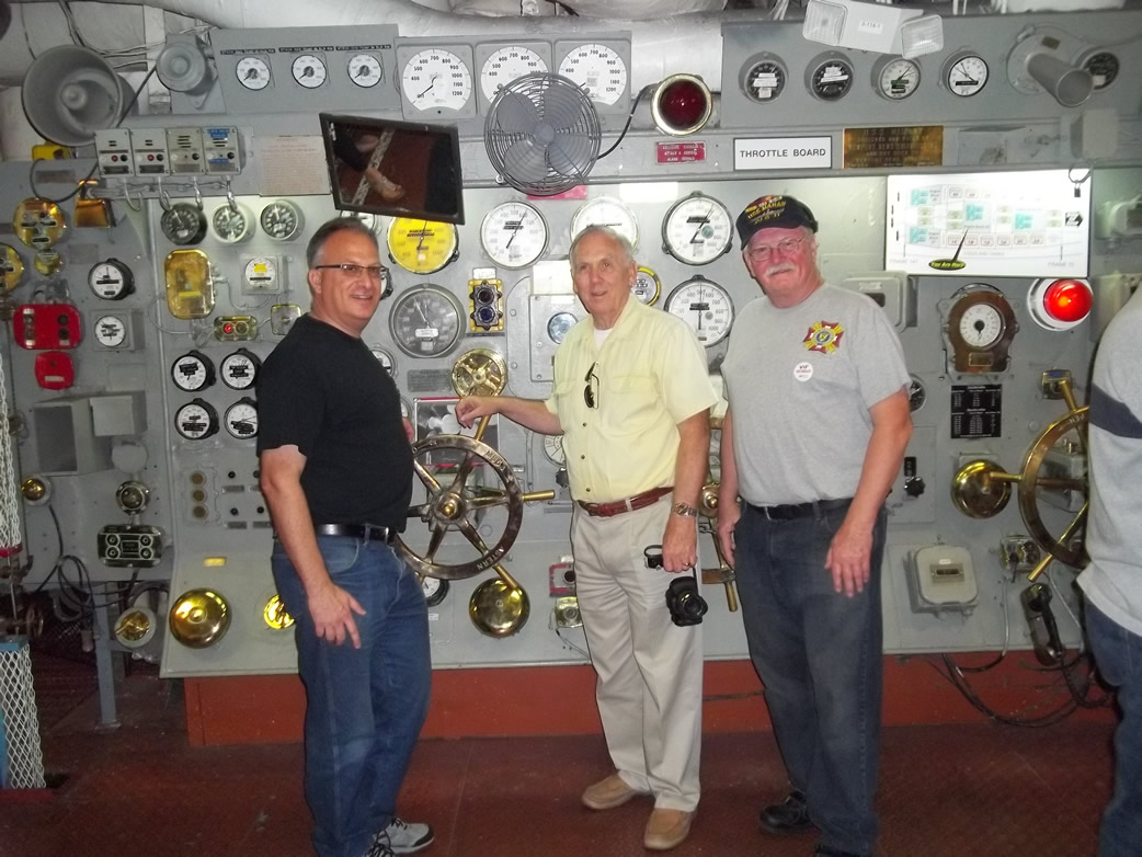 | During the restoration process, we were in contact with Jay, The Big Dog Garage and its General Manager Bernard. There were questions on locating parts, what was correct on a 7-Litre, what parts were interchangeable, 7-Litre artwork and the like. After a lengthy process, Jay contacted us to let us know the car was done and to thank us for our help (that's what 7-Litreites do). He extended the invitation to come out to LA, be his guest at the Tonight Show, and have a tour of the garage. Fast forward to November, 2013. Russ Owens and Garnet Ross were going to make their annual prilgramage to San Diego and they suggested to Vince that this might be the last chance to go to the show with the pending "changing of the guard" at the show (which for the record we all think was a dumb idea). Vince called Jay, and Jay assured him that the plans were set and to just remind him that last Monday before they left, as so many requests come into his office. When the time arrived, the gents all met up in San Diego and had a great trip on the West Coast. Since Russ is a former Navy man, he has "friends in every port". If there is a Navy ship nearby....he knows somebody. So arrangements were made in San Diego, A VIP tour of the Midway was arranged through Russ' USS Mahan Association member Dick Hallowell. He is part of the restoration team and they got to see |