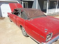 The vehicle is in primer and awaiting the proper funds, as is the case with a bunch of us 7litre guys.George bought it about 15 years ago and has held it in storage ever since. It was in a good "2 stage" primer when he got it and it still is. The vin and door plate decodes properly, having been a silver blue exterior with light blue with rosette pattern vinyl. Not sure about the original top color, that was one he couldn't figure out from the vin. It is a 4 speed on the floor convertible it still has the proper 428 it came with. The odo shows 94254 miles |